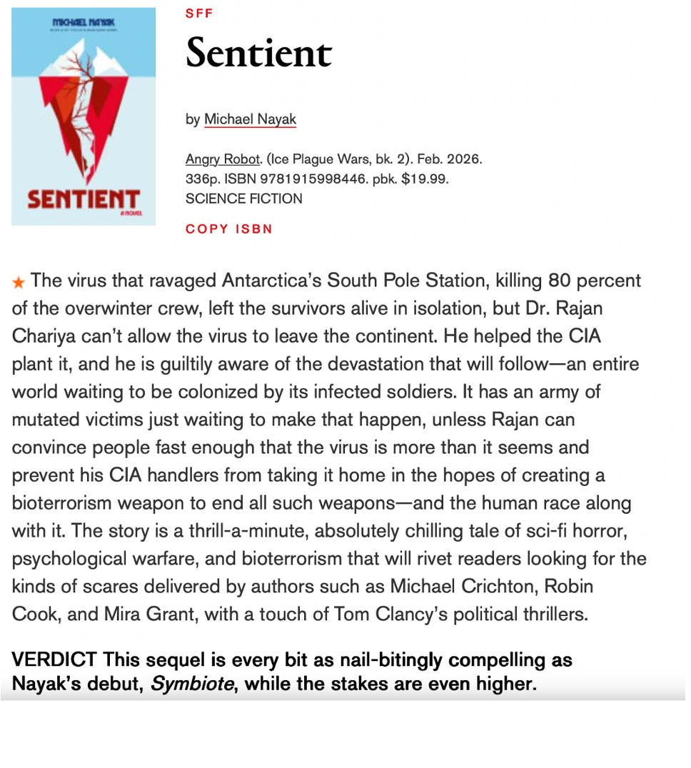 I’m excited to reveal the first excerpt from the sequel to my debut novel: Sentient, coming February 2026 from Angry Robot Books. Huge thanks to FanFiAddict for the reveal!